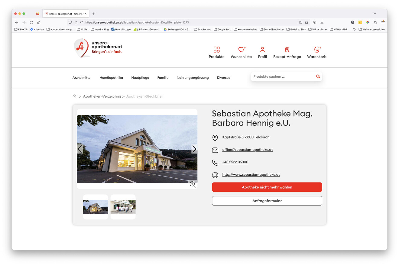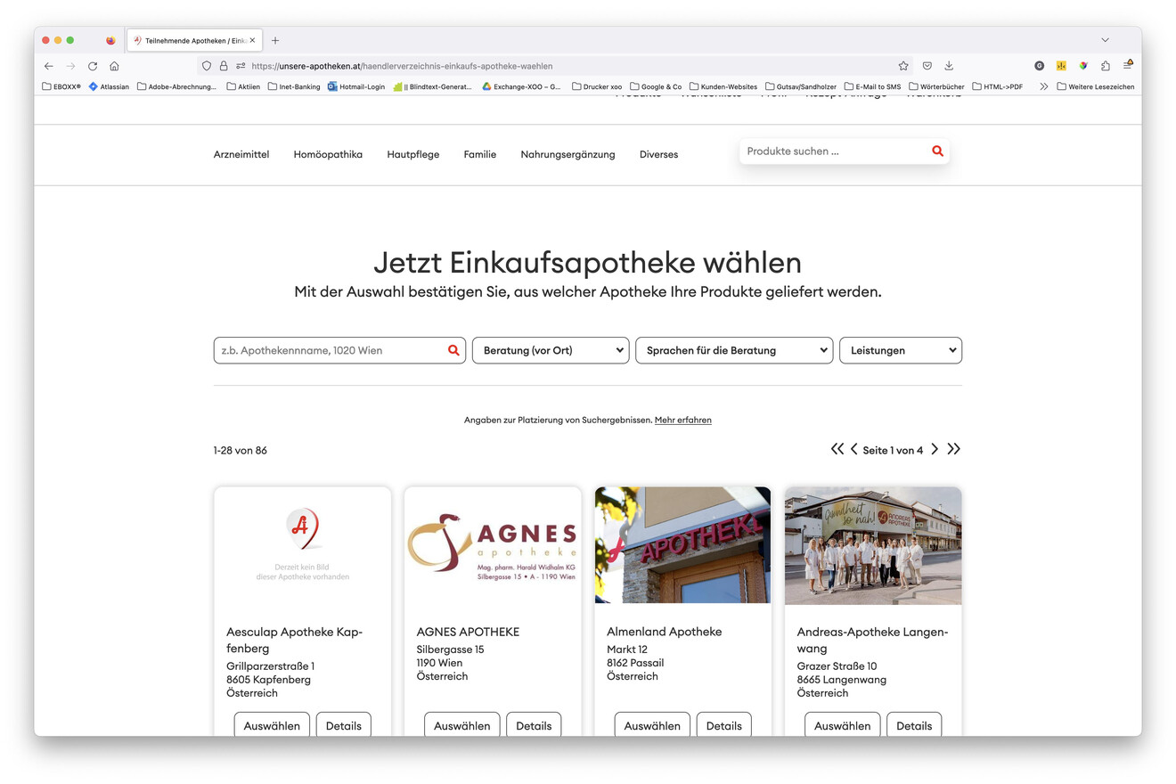 "Willkommen auf Unsere-Apotheken.at, dem offiziellen Online-Marktplatz für österreichische Apotheken, beauftragt vom Österreichischen Apothekerverband. Über 150 unabhängige Apotheken präsentieren hier ihre eigenen Produkte auf einer zentralen Plattform und verwalten mühelos Tausende von Artikeln, dank unserer in Vorarlberg entwickelten Shop-Lösung. Keine komplizierten Kenntnisse notwendig. Einfach zu bedienen und leicht als neuer Verkaufskanal für jede Apotheke im Geschäft zu integrieren.